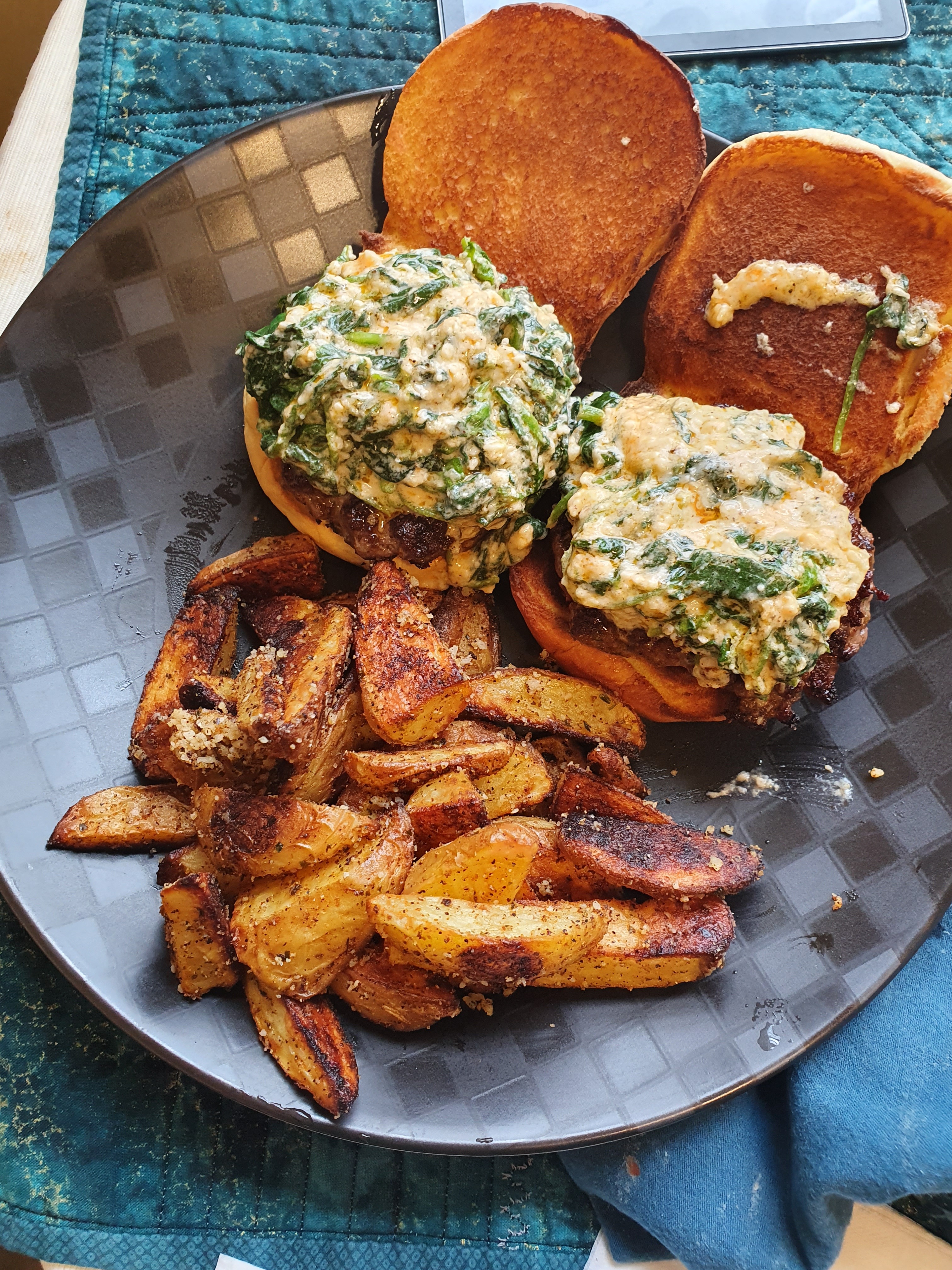 The topping is spinach, mascarpone, parmesan, garlic, and hot sauce. It was surprisingly great. They also have you mix in their “Weeknight Hero” spice blend to the burger meat (and the fries) - it’s like, onion and paprika and whatnot. I don’t know if I noticed it in the burger patty but at least it wasn’t a clashing flavor profile like the Italian seasoning from last time. That nearly turned me off doing beef burgers from them at all.