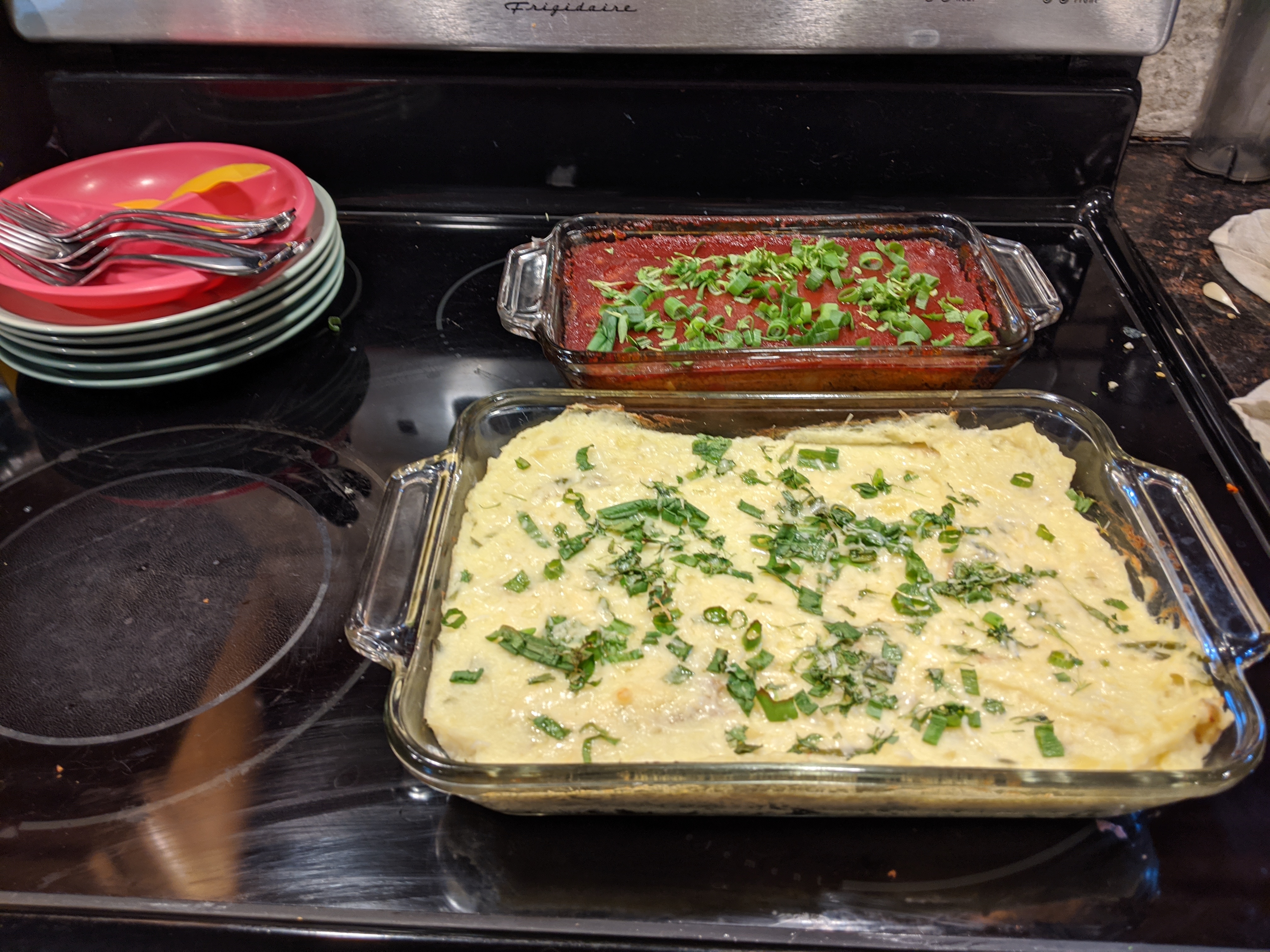 Boiled the potatoes and cauliflower with some rosemary sprigs, and also melted the butter, sour cream and soy milk (didn’t have milk or cream) with some rosemary and garlic powder. Then covered them with parmesan, green onions and cilantro and baked for 15 minutes.