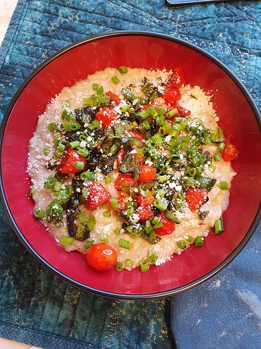 Risotto (including garlic, shallot, mascarpone, butter, and romano) with cherry tomatoes, poblano pepper and jalapeno, garnished with chives and the rest of the romano. I am a total sucker for risotto and wouldn’t have thought to use spicy peppers with it. This was also very .