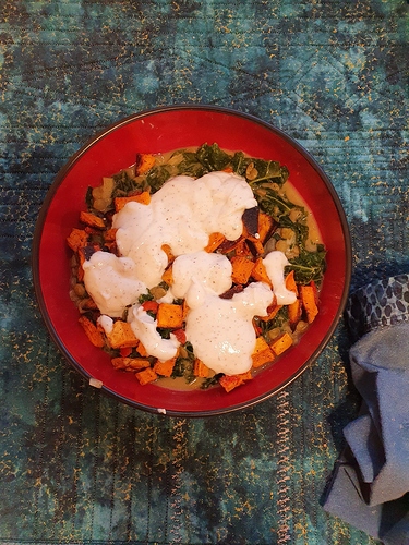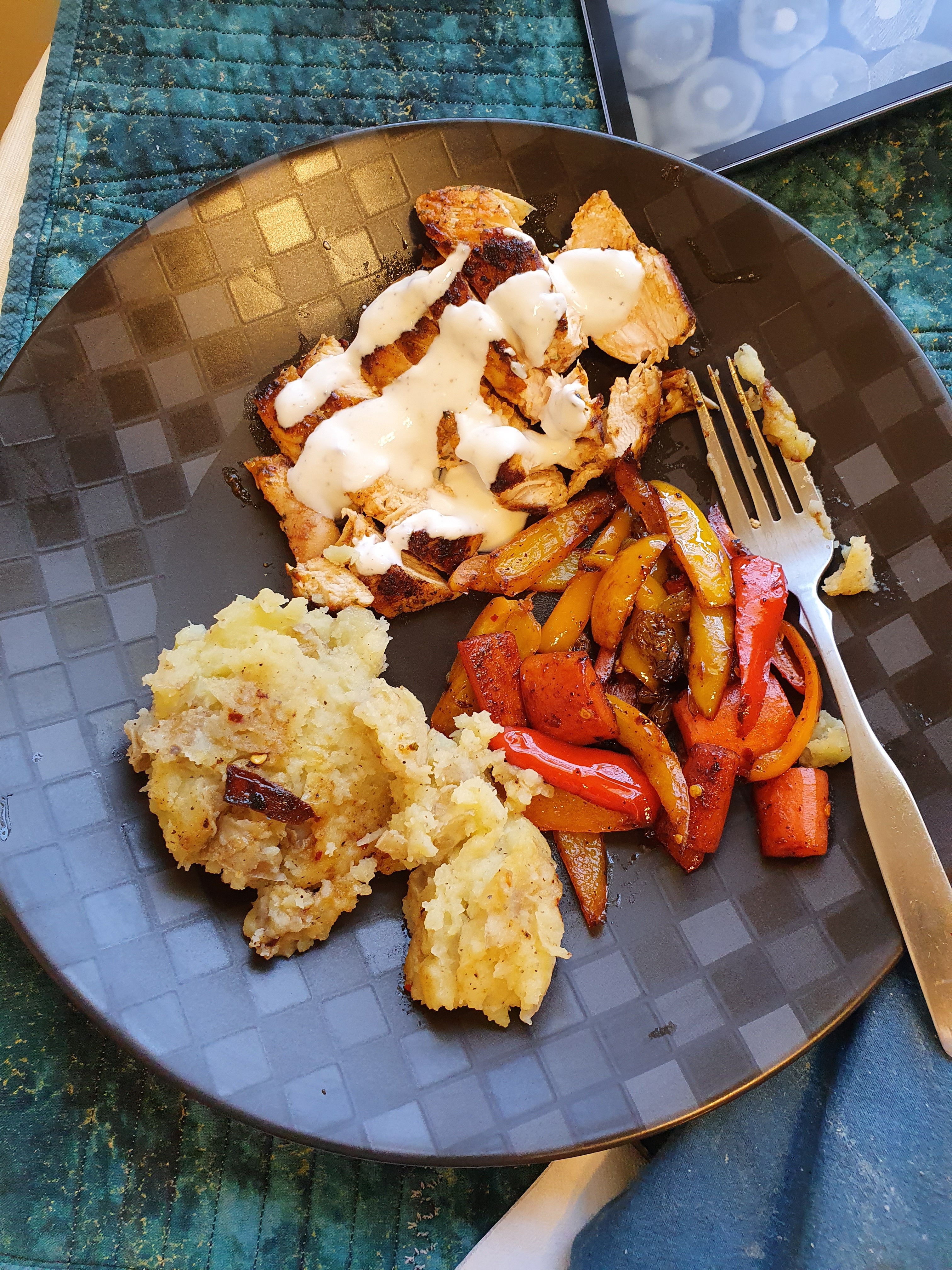 Seared chicken with goat cheese sauce (literally you just loosen the cheese with some water), mashed potatoes, and sauteed carrots, sweet peppers and raisins in an agrodolce sauce.