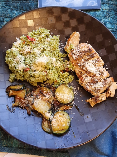 Italian-seasoned chicken, basil pesto/piquante pepper brown rice, and pan-fried zucchini with lemon juice. This was apparently sponsored by HBO Max, god knows why. Pretty simple and yum, though.
