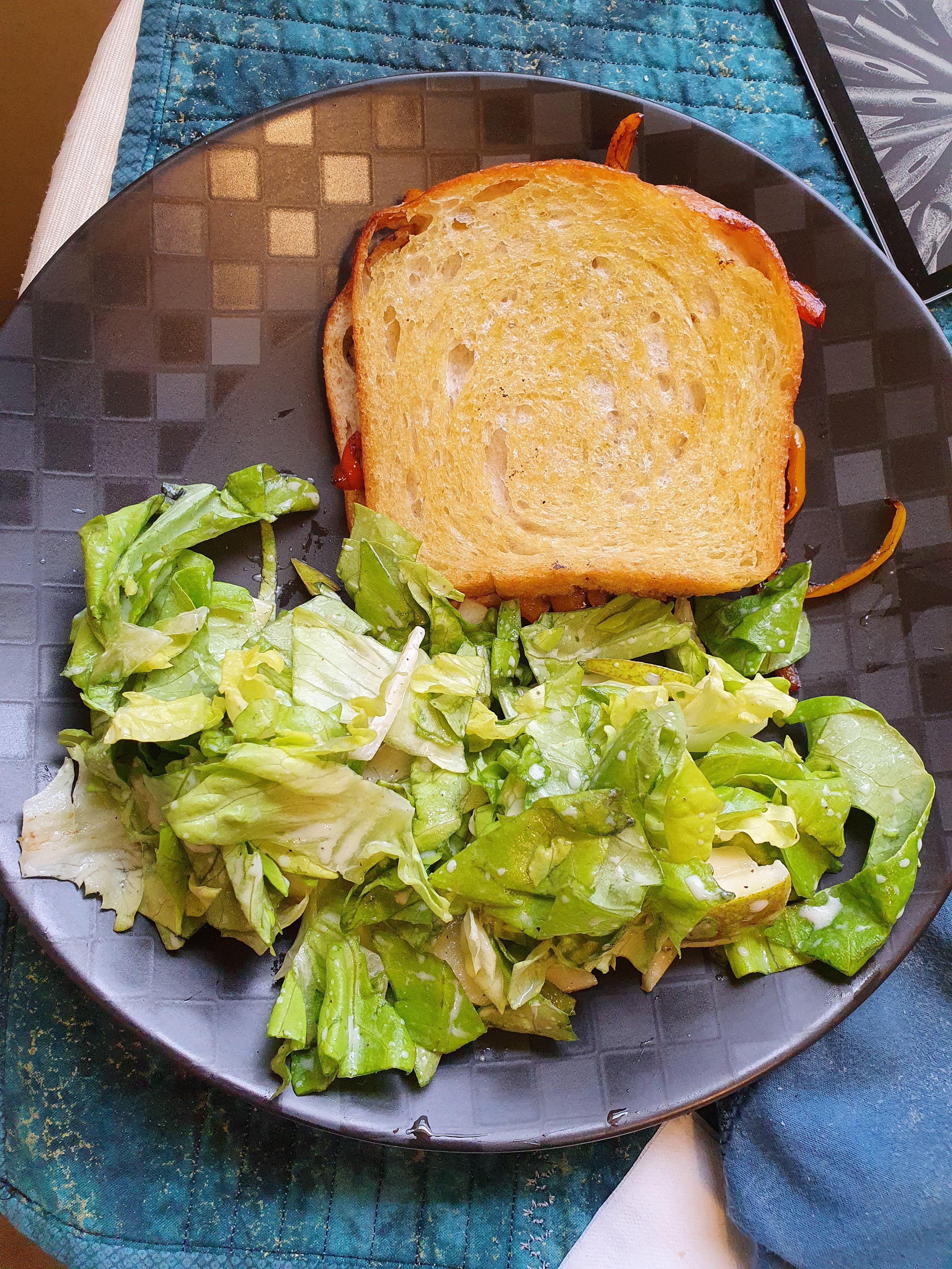 Grilled cheese sandwiches with a combination of fontina and gouda for the cheese, a fig spread, and sauteed sweet peppers in vinegar; as well as a butter lettuce salad with sliced pear. (I tend to find lettuce salads boring and this wasn’t especially memorable, but the sandwich… )