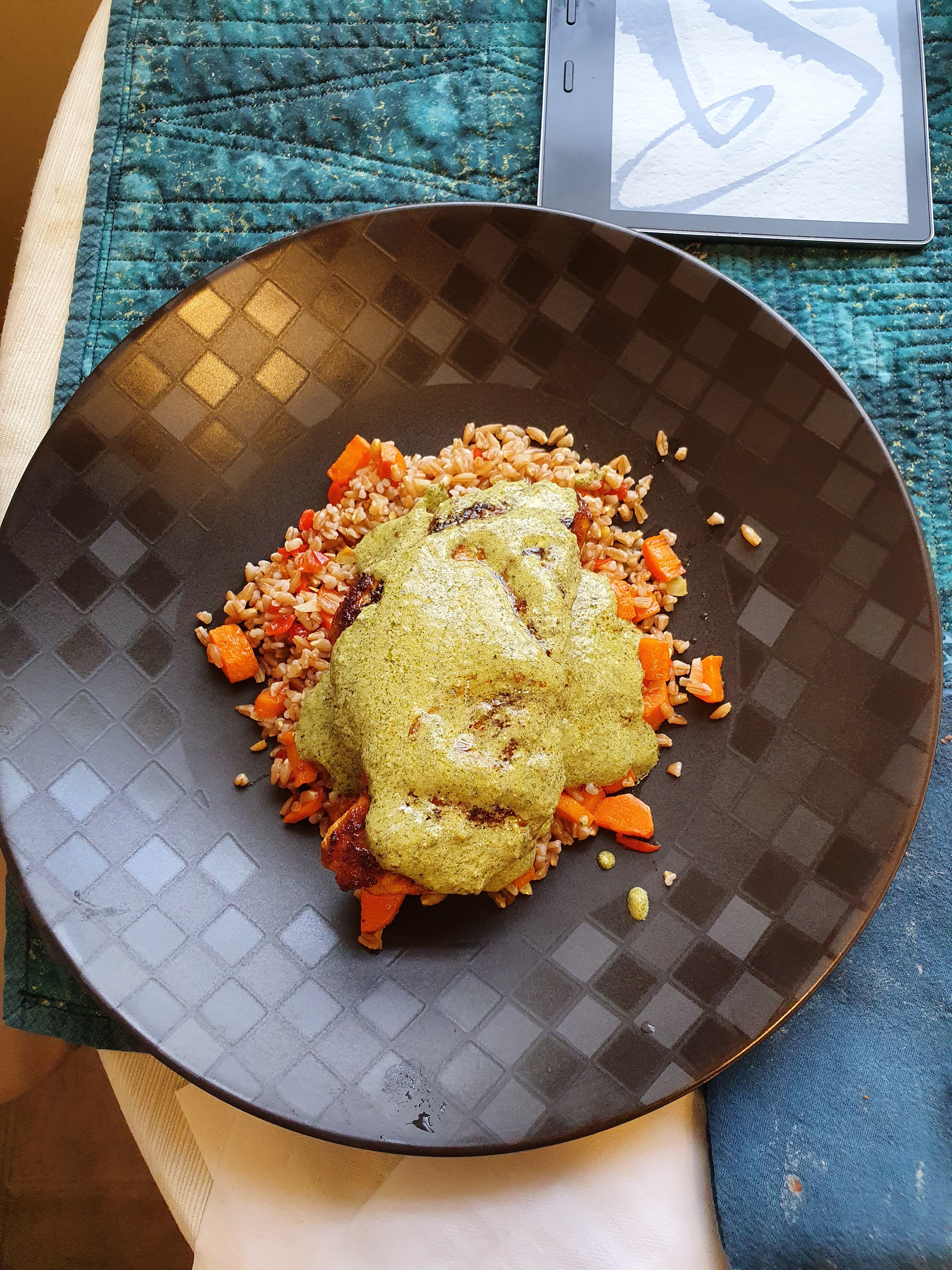 Seared chicken on a bed of farro with carrots and piquante/chile peppers, topped with a basil pesto/fromage blanc sauce (which has managed to mostly obscure the chicken in the photo, oh well).