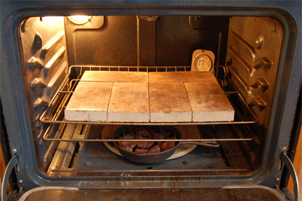I keep an old, non-specific pizza stone on the bottom of the oven to help moderate the temperature swings (and catch sugary drips from pies), but I shift the racks about often enough that a near-permanent cordierite stone wouldn’t work. A smaller tile arrangement might, provided I can stack them in the adjacent cabinet like I do the bricks.