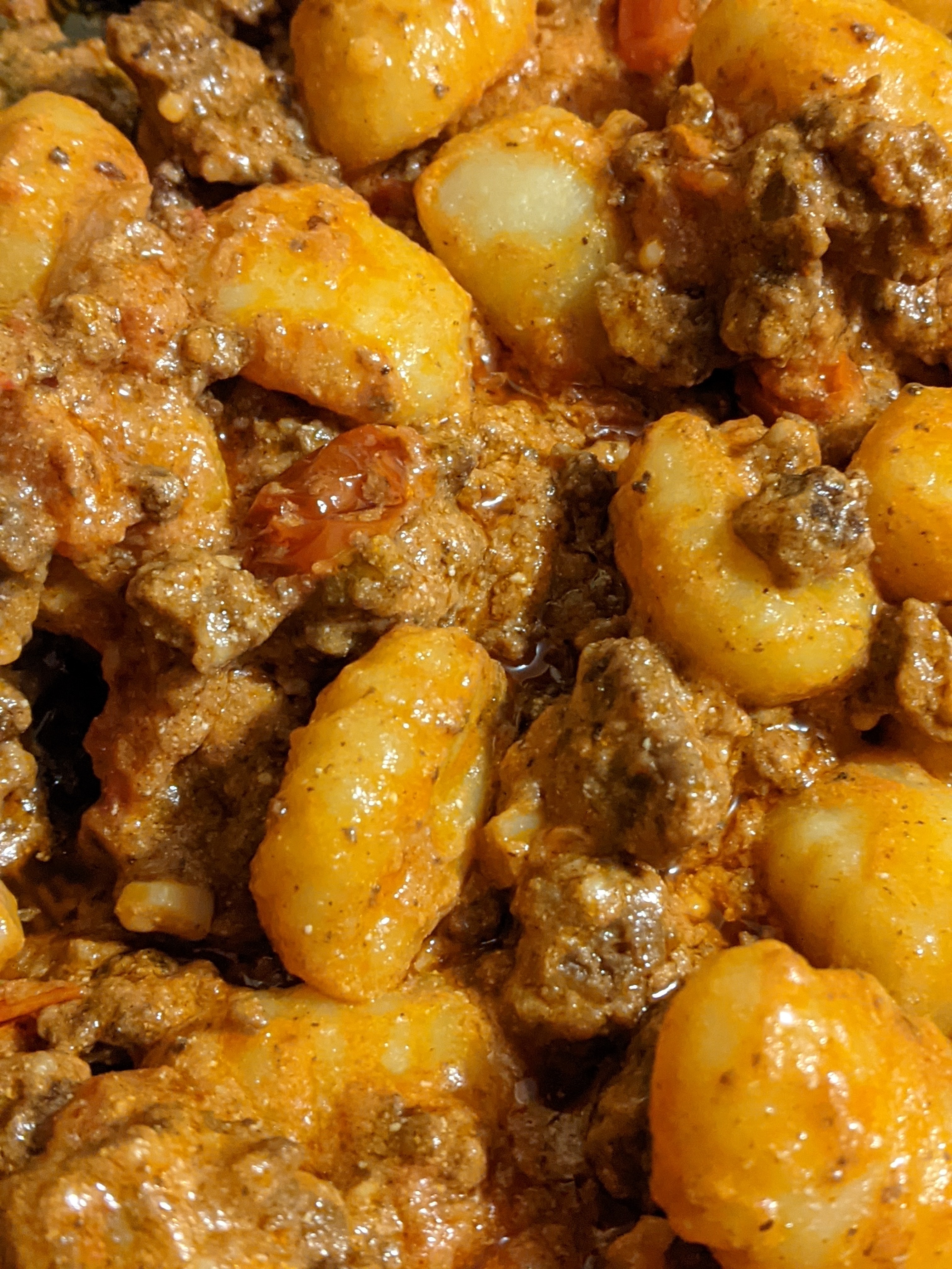 Made Gnocchi (not from scratch) with a cherry tomato mascarpone sauce. I have the tomatoes and some onions and garlic and cooked it together then and removed and browned the beef then incorporated it. I added fresh Parm and a splash of vinegar to temper the sweetness a little.