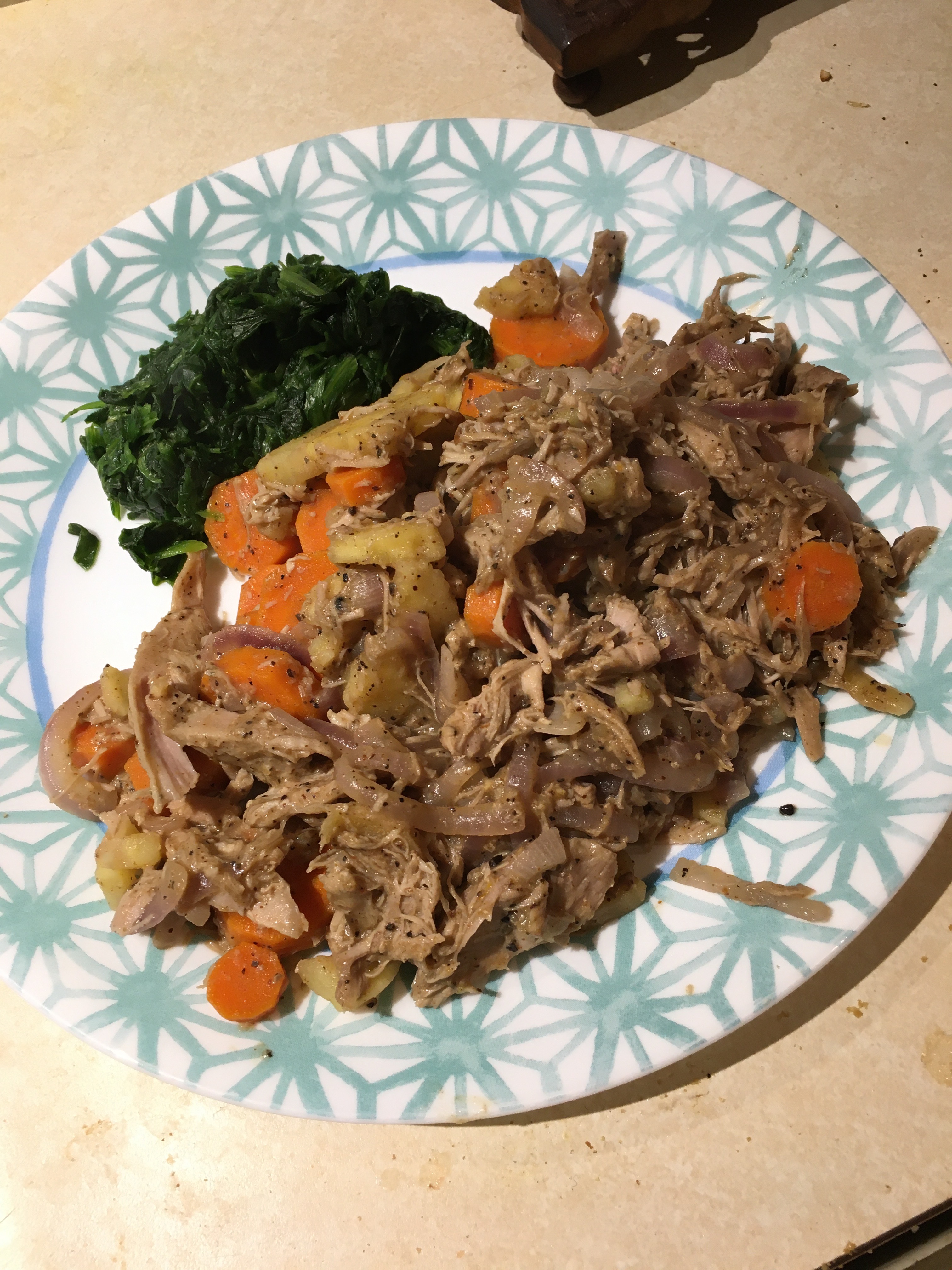This week I was able to buy turkey thighs at Sprouts, so tonight I made turkey garam masala. Yesterday I boiled the turkey thighs till the meat started to fall off the bones, and then put them in the refrigerator (and froze the broth for later use—it was on its third cycle and starting to develop real flavor). Today, I cut the meat into strips, and recooked it in light coconut milk with red onion, carrots, and lightly microwaved and peeled sweet potatoes till the liquid was condensed nearly to dryness. Everyone has their own garam masala; my preferred combination is large amounts of black pepper, coriander, and cumin, with smaller amounts of allspice, ancho chili, cardamom, cinnamon, cloves, and orange peel.