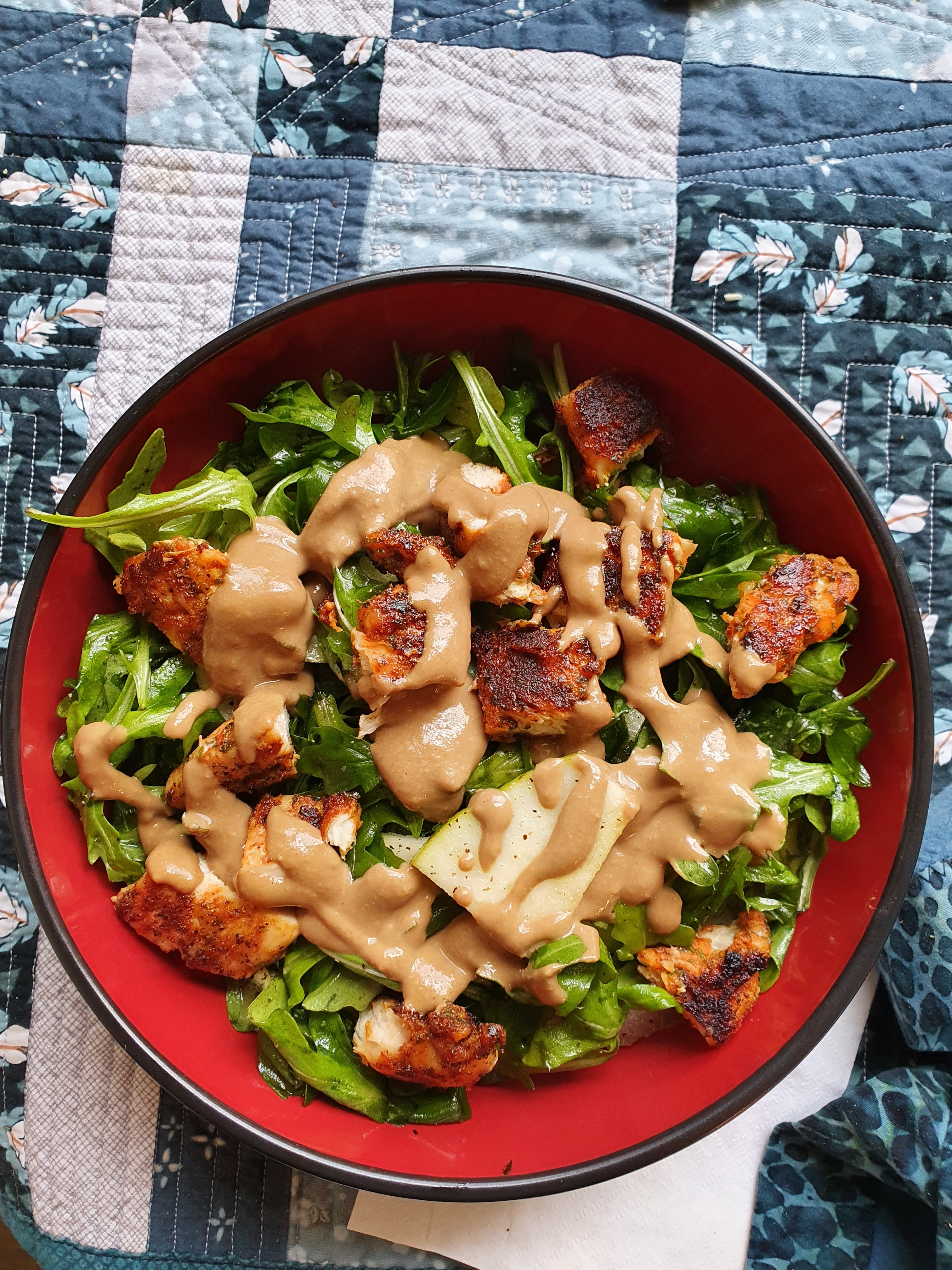 (barley with roasted fennel and onions; arugula, sliced pears, spiced chicken; tahini/dijon/balsamic dressing)