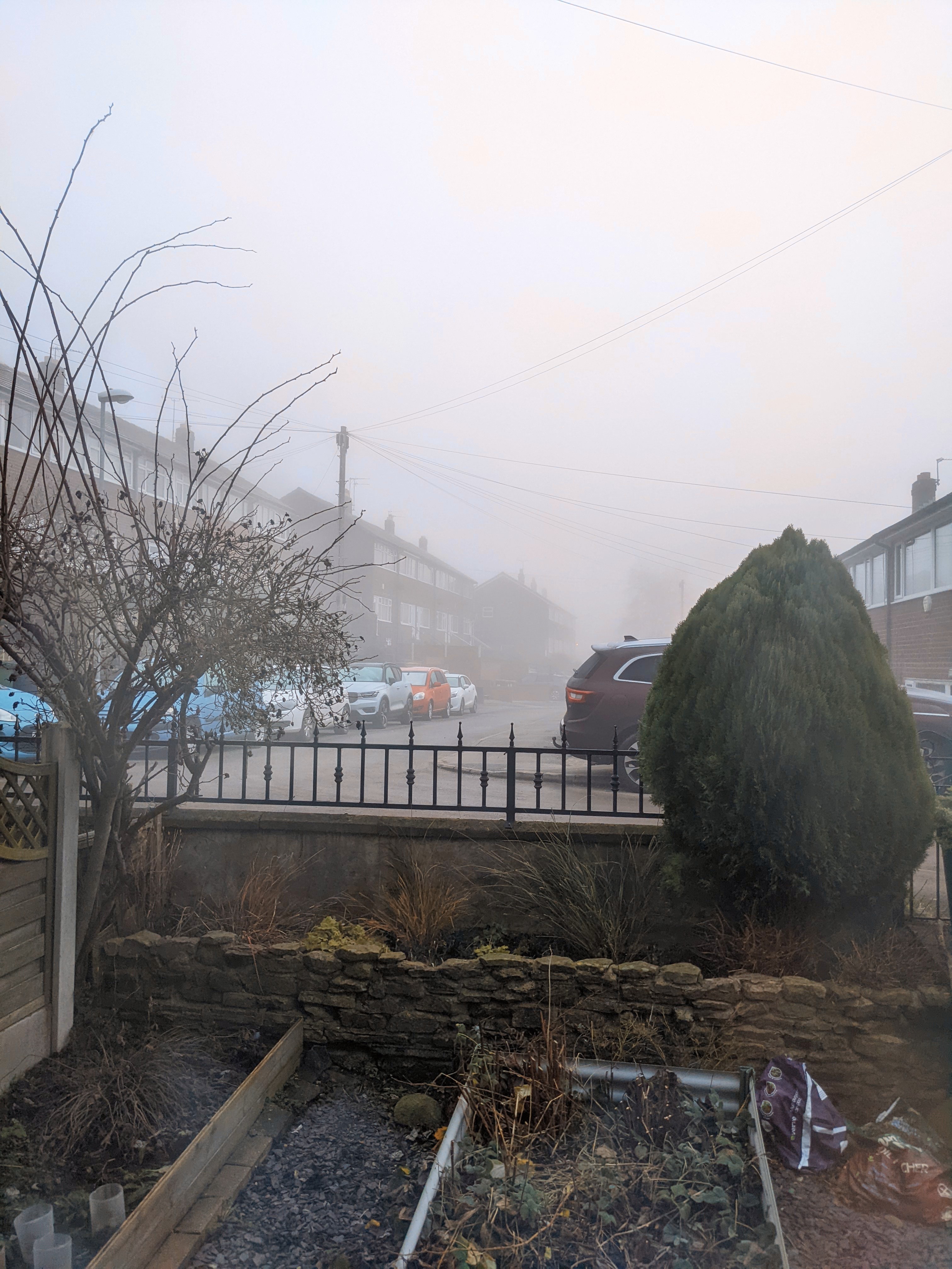 Anyway, here is the view of the sky from outside our house this morning and then an hour later when a whopping great fog rolled up…
