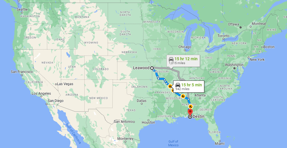 Travel map for those that don’t necessarily understand the scope and scale of travelling through the US. That’s Leawood, Kansas to Destin, Florida for my non-American readers