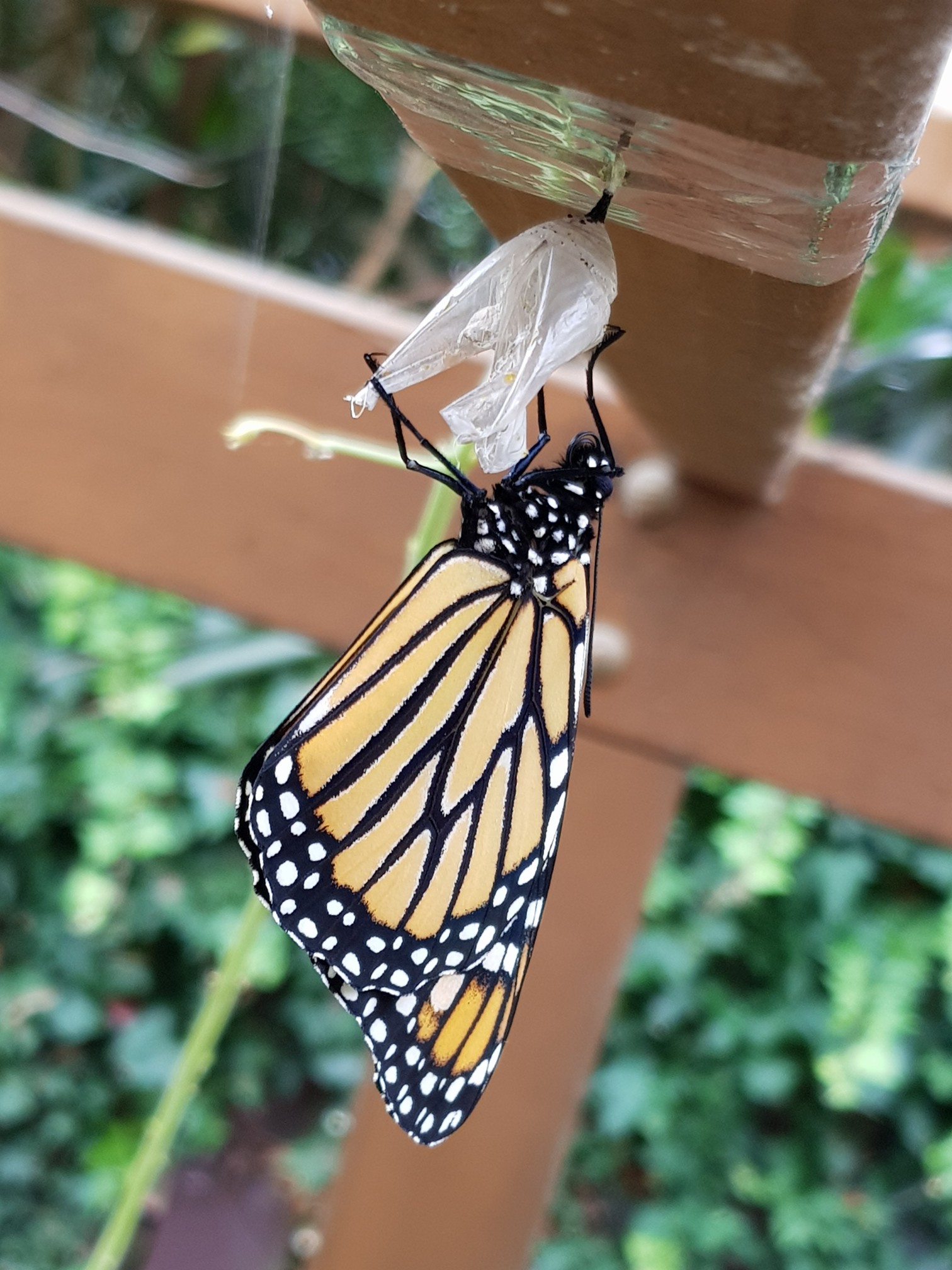 I love the gold-coloured bits (which are there from the outset), and this morning I can see the butterfly inside. This one is taped to the beam because it had made its chrysalis on the underside of a leaf, and another caterpillar then ate the leaf! (I’m hoping it’ll be ok, as it had quite a fall from that at the time.)