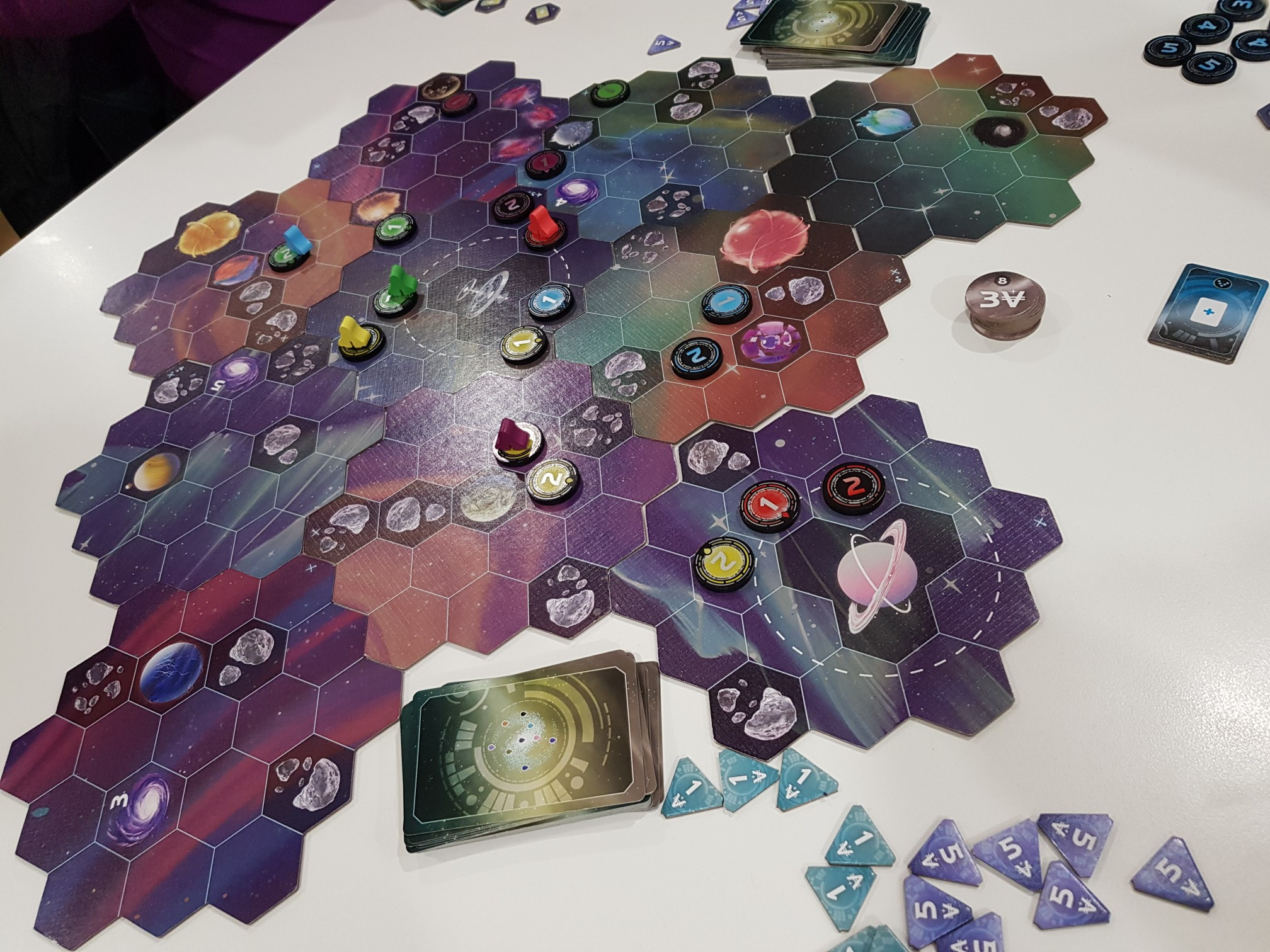 First play. Neat! It’s a pick-up-and-deliver game of being a Galactic Taxi driver. You can normally move a maximum of 3 hexes per turn, but pretty much everything else in the game is a free action, including placing one end of a wormhole at your current position; and once both ends of a wormhole have been placed on the board then moving from one end to the other costs nothing at all. You have a half-dozen wormholes, but you cannot start setting up a new one until you’ve completed the previous one.
