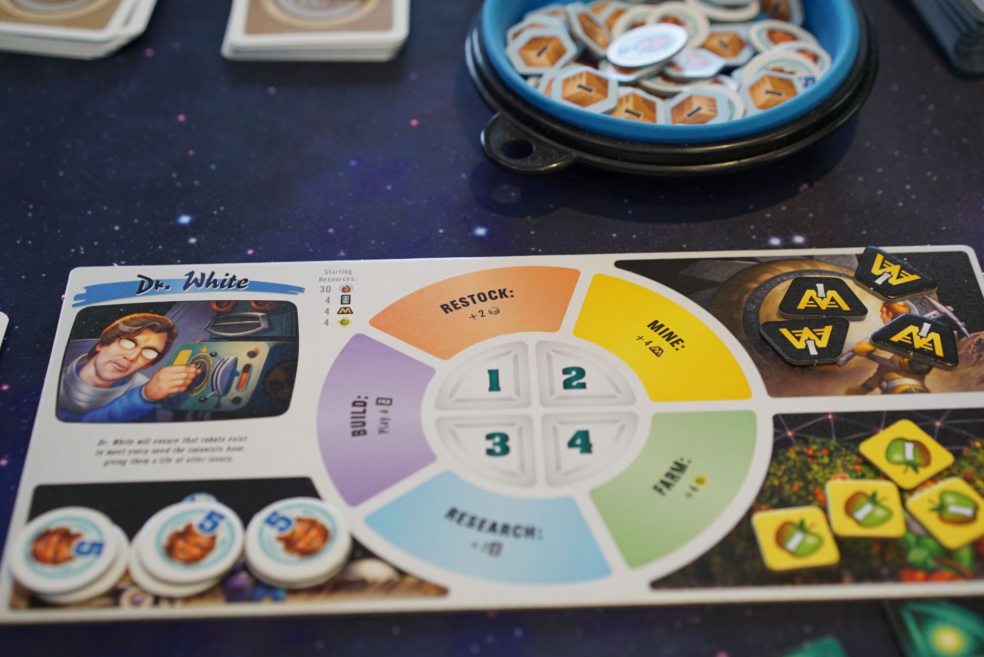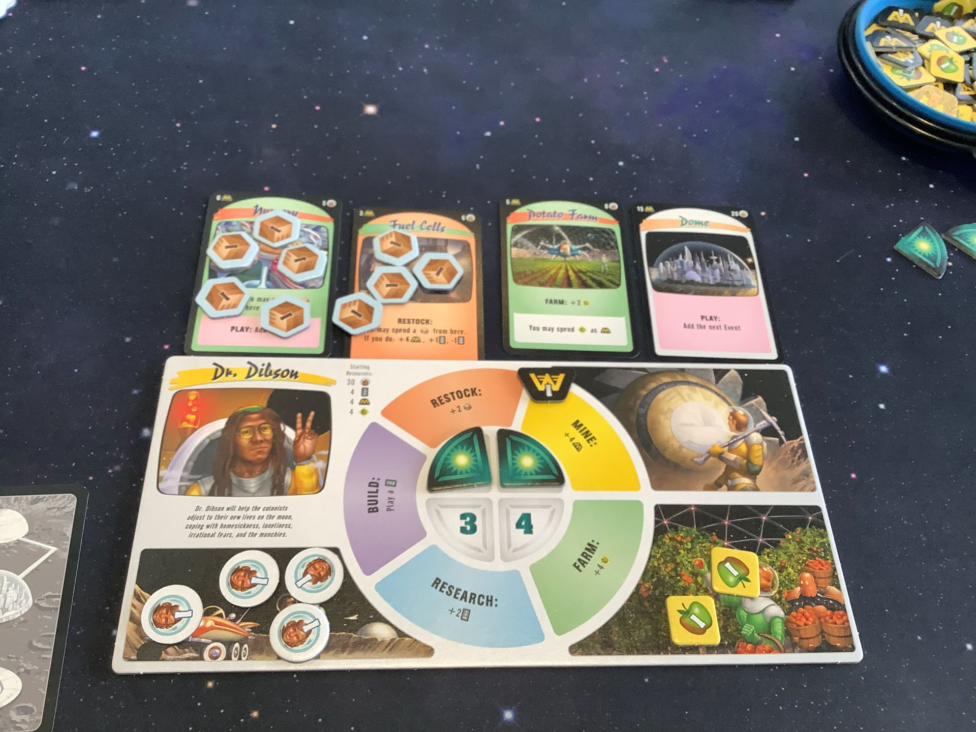 Moon Colony Bloodbath, first play. This is a deck builder where you earn money and food, while building structures that house people. It all starts pretty easy, you’ll be doing one of the six main actions: restock (adds boxes to buildings), build (construct a building), mine (get money), farm (get food), and research (get new building cards). On each turn, you turn over a card from the progress deck. The deck starts with the same types of cards – work (you choose one of your actions), trouble (adds an event card to the deck), or twist (gives you a special ability). As you gain event cards, things get worse and worse for our intrepid moon colony people. Mostly you’ll lose people, and if you run about of those, you’ll need to trash a building for its people. The game ends when someone runs out of people, and then the winner is whoever had the most people. It’s a pretty quick game, and good fun.