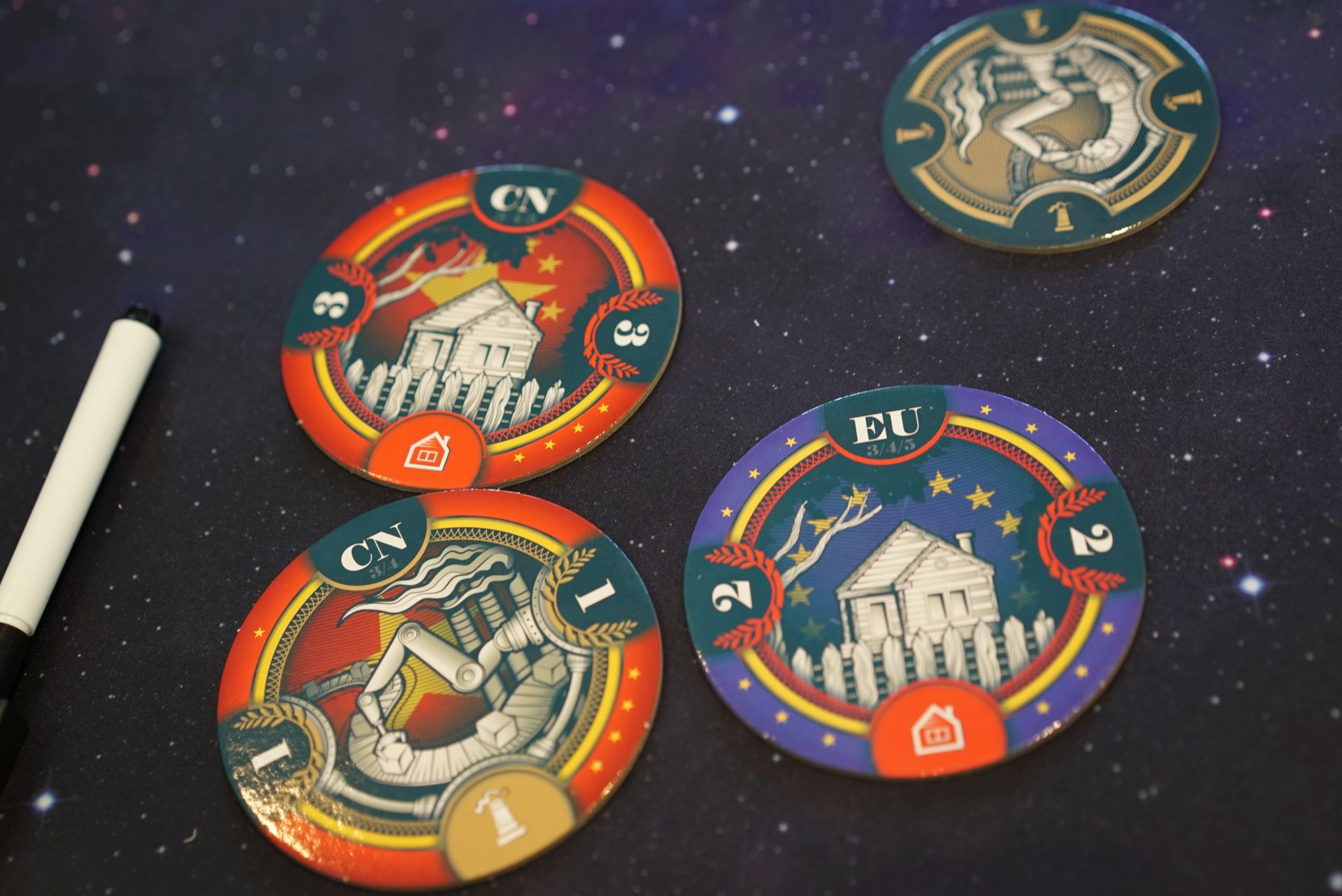 QE, an auction game where you make up your bids, and they can be any number you can think of. Really want a card? Well, make a bid of a billion. Each player takes a turn at being the auctioneer, and they make a public bid. Then everyone writes their bid, and the auctioneer takes all the secret bids and determine the winner. You’re bidding on tiles that belong to a certain country, have a specific type, and also a point value. You want to win the tiles with a company or type matching yours.
