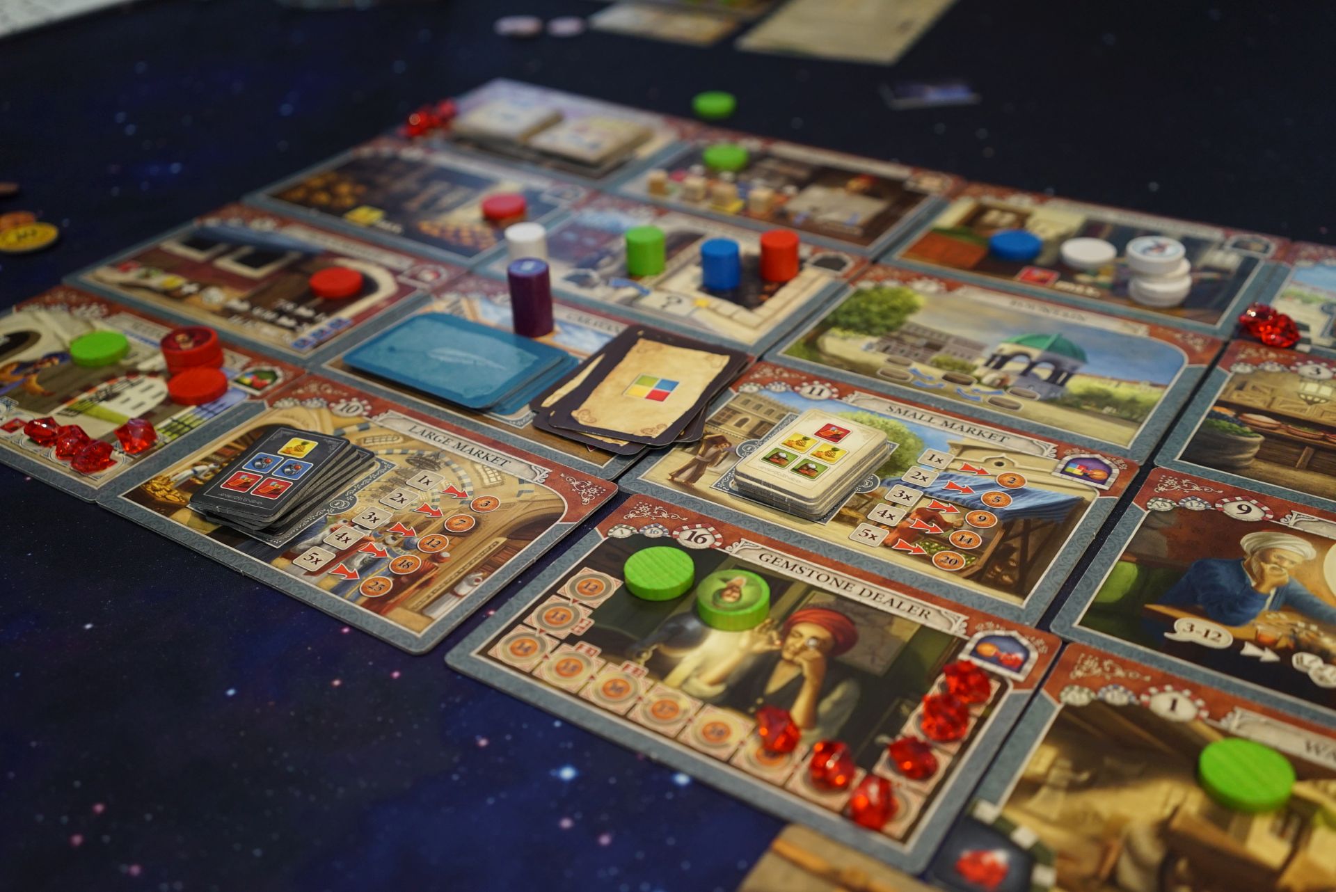 Istanbul, it’s been a while since we played this, but it doesn’t take long to get up to speed. There are 16 tiles places into a four by four grid. On your turn you move your merchant and assistants between tiles. When you stop on a tile, you have a drop an assistant, unless there was one already there (from an earlier turn). There are four colours of goods to use. You can sell goods, use them at mosques to gain special ability tiles, do some gambling, go to the post office, and other stuff. It’s all about the gems, and there are a few ways to get them. To win you need five gems. It’s an efficiency puzzle, trying to drop your assistants so they can be picked up again. Good game, should play it more often.