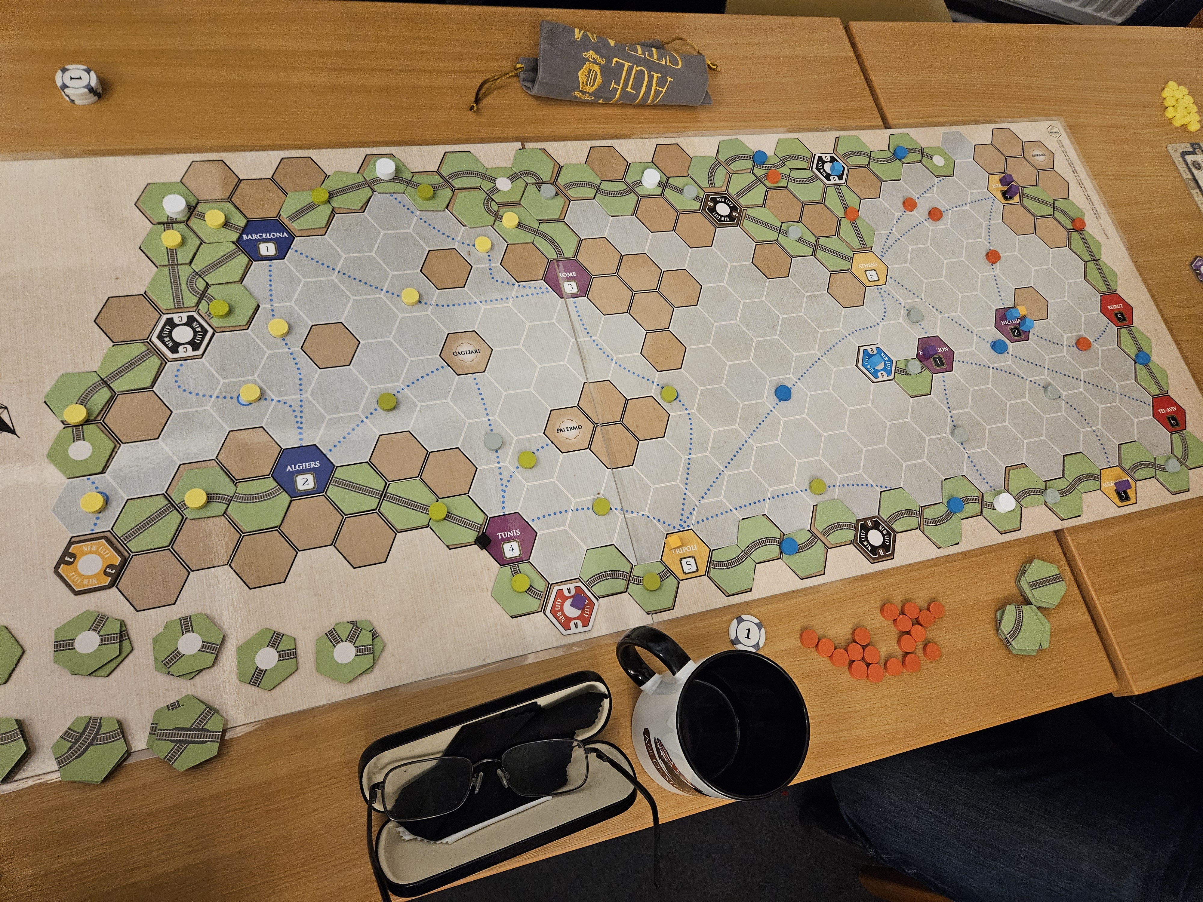 Mediterranean - 5 players and sheesh very brutal with the fight for land spaces. The map is large but that is misleading. You can’t have train tracks on the Med itself, but you can construct ferries (as you can see on the photo) once per turn. The land spaces are rather tight and full of bottlenecks. Eeep!! And with 5 players, we end up sharing tracks due to this.