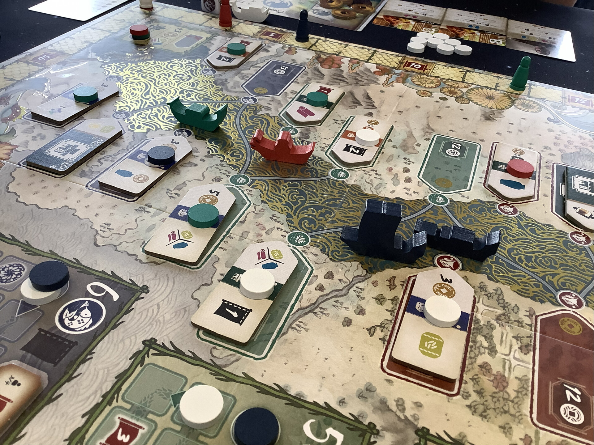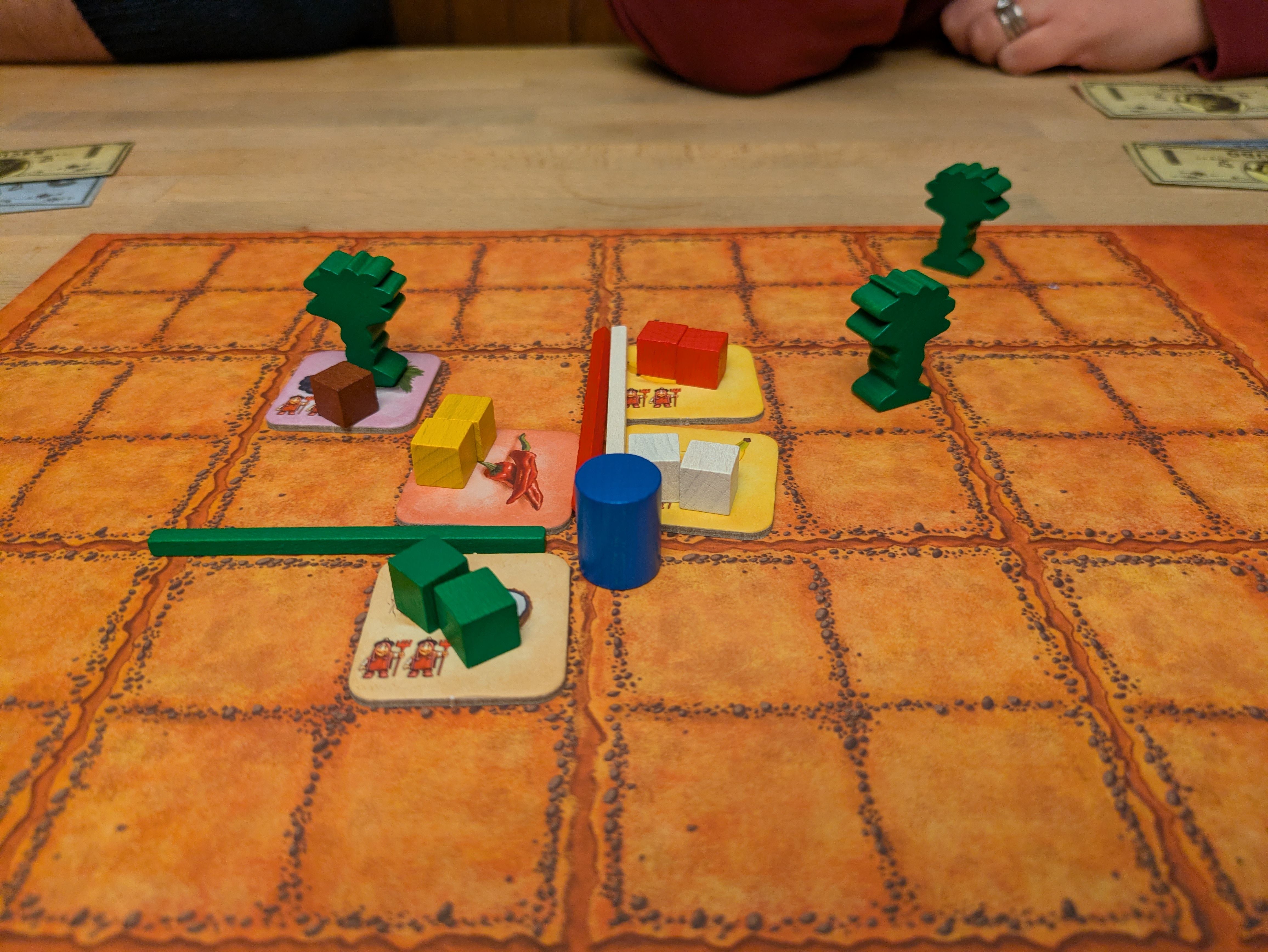 River of Gold, first play. Roll your dice, either move down the river or build. Building gives you points to move down a track, as well as other things. A building gives benefits to any one who stops there along the river. As well as something for the owner. You are also collecting resources to fulfill customer cards.All went fairly smoothly, nothing too compelling.