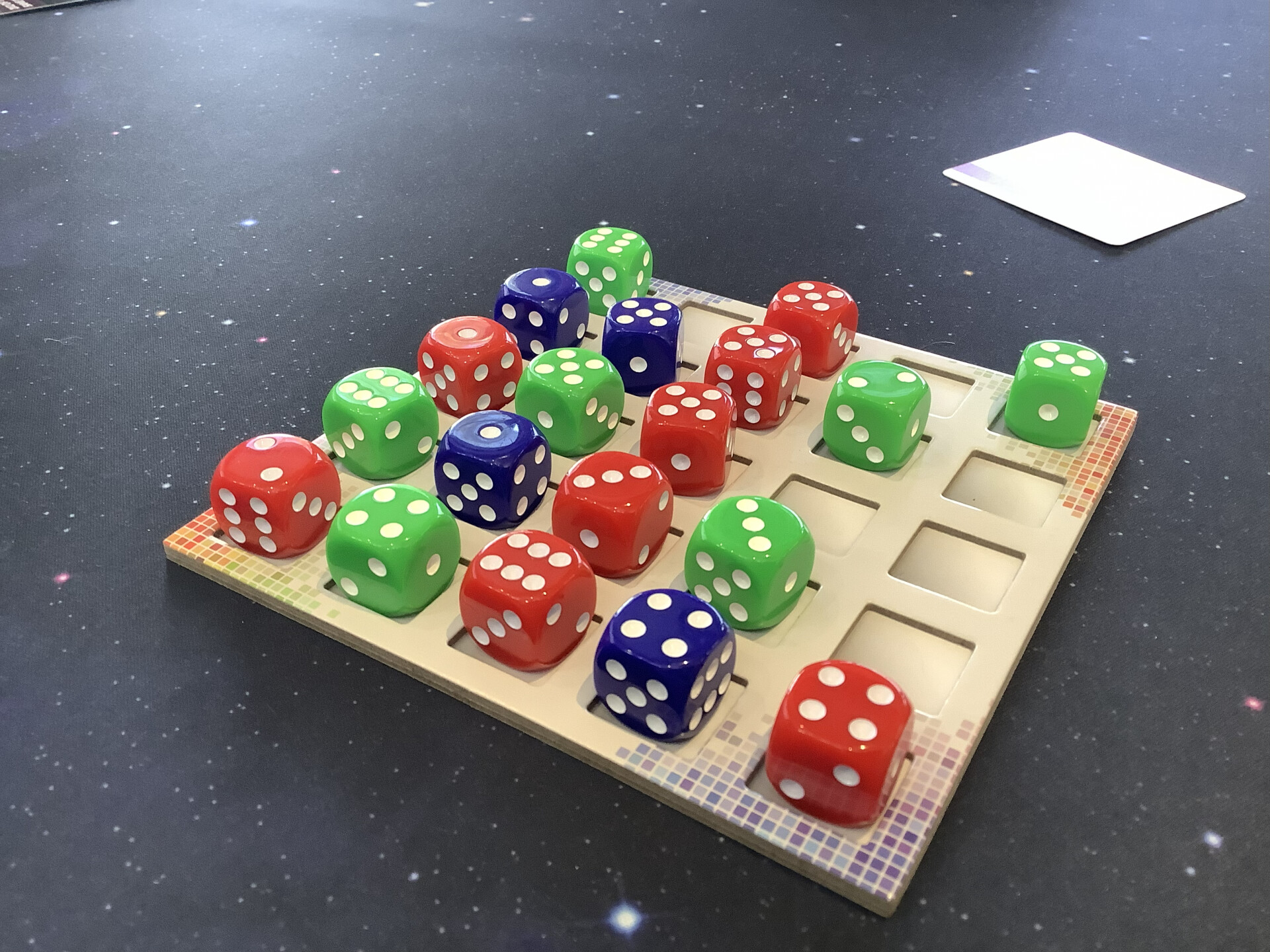 Five by Five, a quick game. On your turn you play a card, which are either colours or abilities. If you play a colour, you roll that colour die and add it to the (five by five) board. Ability cards allow you to do stuff like swapping two dice, or rerolling one. This is all to do objectives, which can be something like “have a line of odd dice” or “have an even die in a corner”. Objectives give various points. I started with very high point objectives, which were going nowhere, so I discarded them for new ones. Good, simple dice game.
