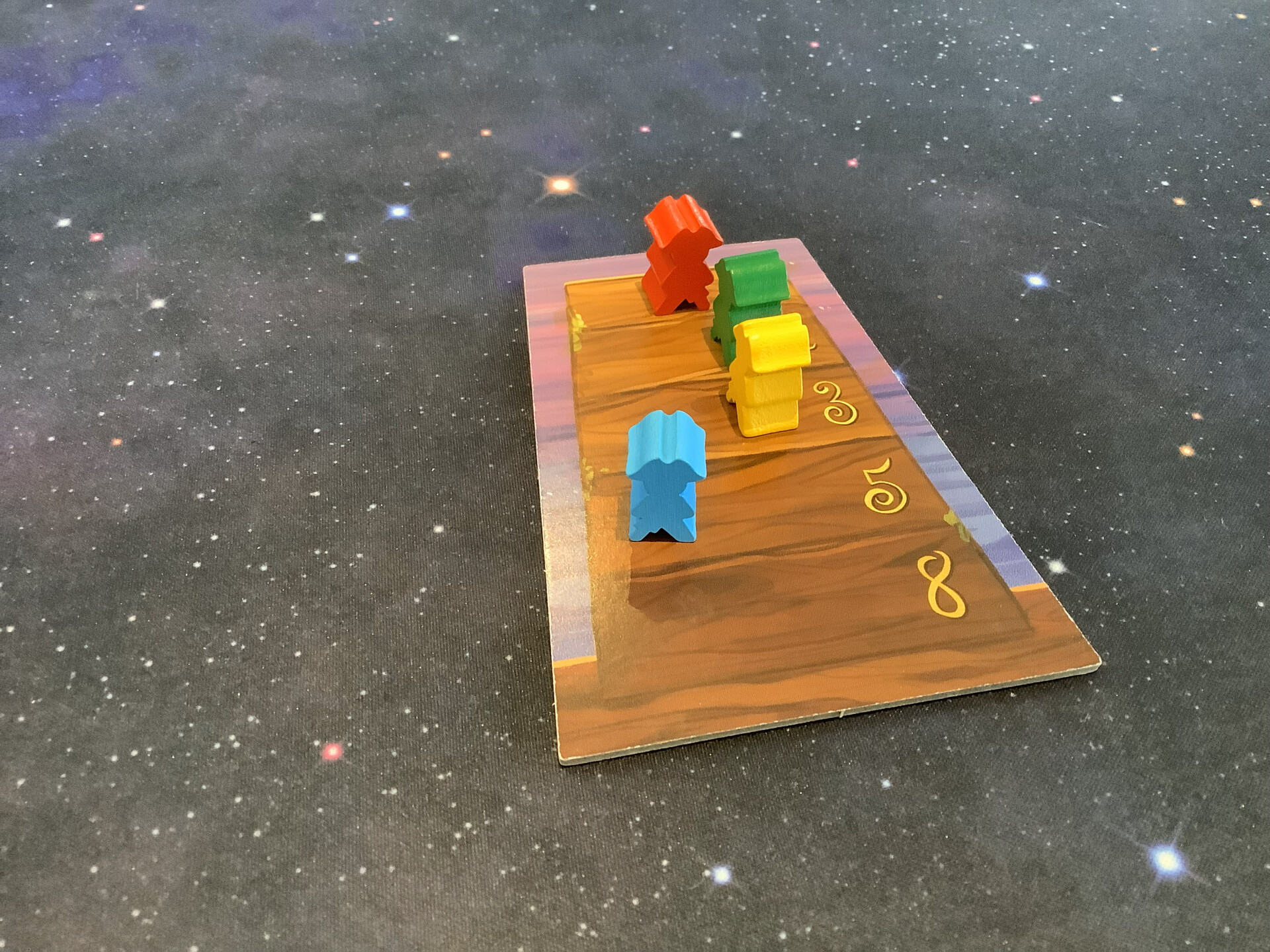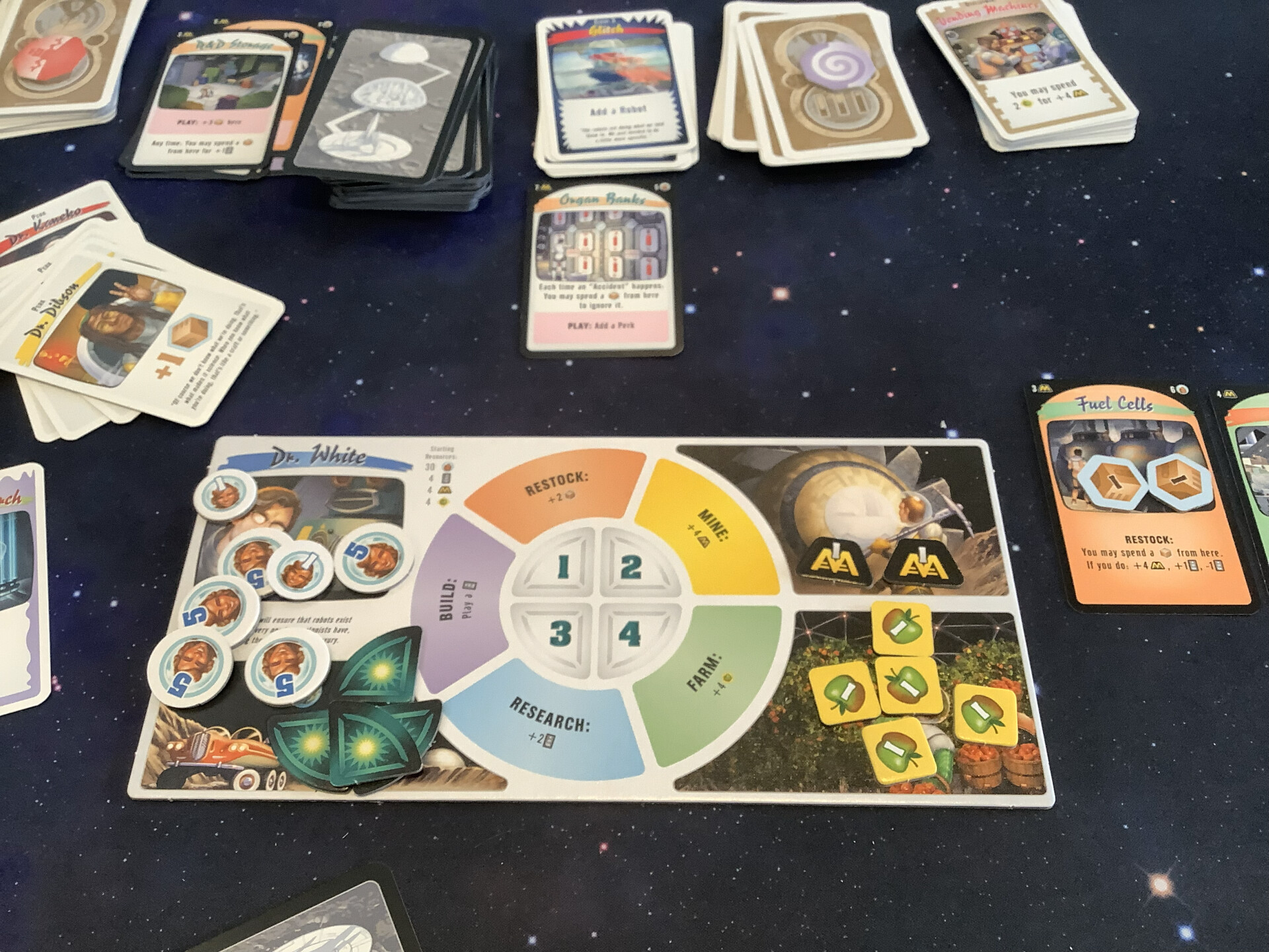 Started out salty, as the owner had not punched/sorted/unwrapped everything, so an already long game had a bit of a prelude. Secondly, someone had dropped out and the owner had swapped a new player in day-of, so we further delayed with a long teach… (we’ve all got kids, the etiquette is to learn the game before hand so we can spend our very limited time actually playing). And as a result, we only played through three rounds.